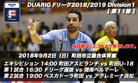 9月2日(日)にDUARIG Fリーグ2018/2019 第10節 Fリーグ選抜vs湘南ベルマーレ、ペスカドーラ町田vsアグレミーナ浜松の共同開催が町田市立総合体育館で行われる。