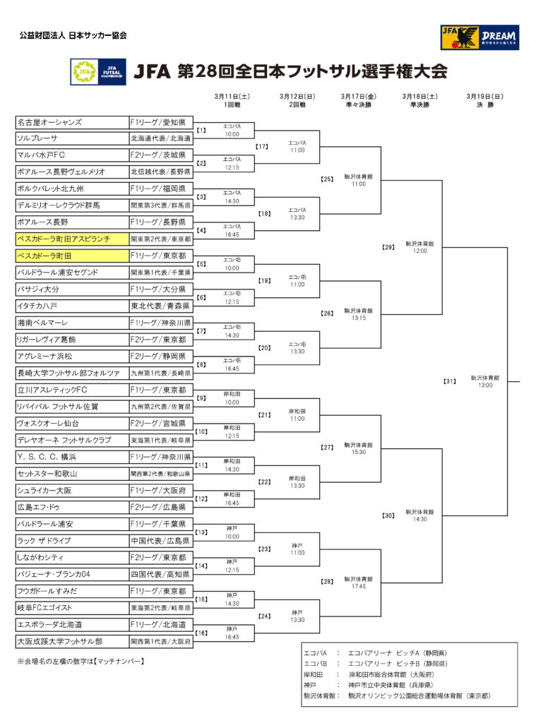 3/11(土)から開催されます「第28回 全日本フットサル選手権大会」の組合せが決定しましたのでお知らせします。今シーズン最後の公式戦となるこの大会には、トップチームだけではなくアスピランチも出場が決定しております。応援のほどお願い致します!