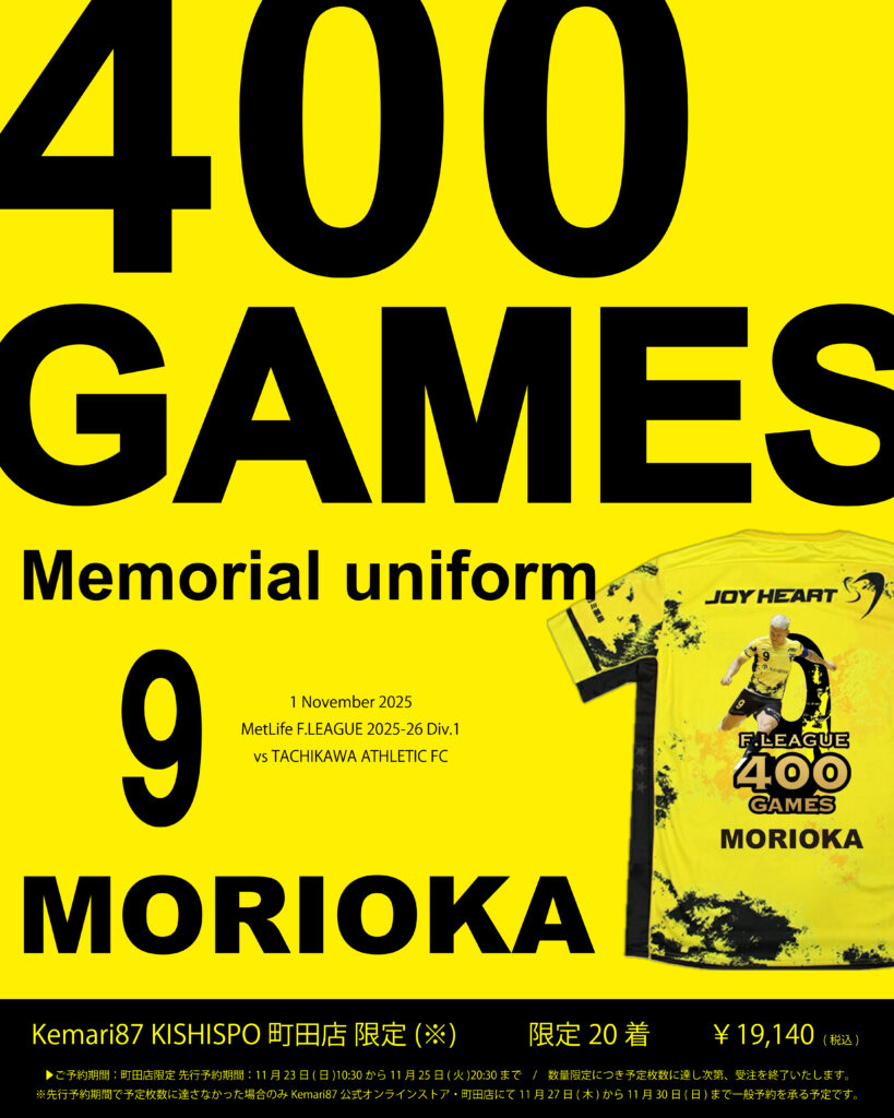 11月1日(土)立川アスレティックFC戦にて森岡薫選手がFリーグ通算400試合出場を達成したことを記念して、11月23日(日)よりKemari87 KISHISPO 町田店にて達成記念ユニフォームを数量限定にて予約販売しますのでお知らせいたします。