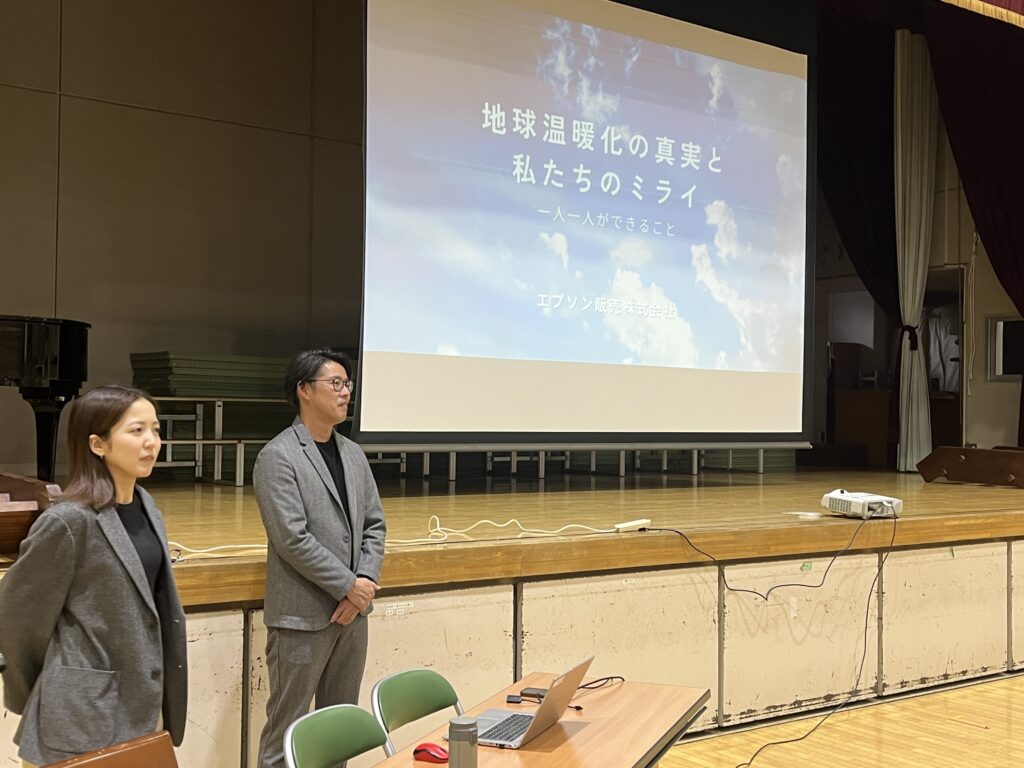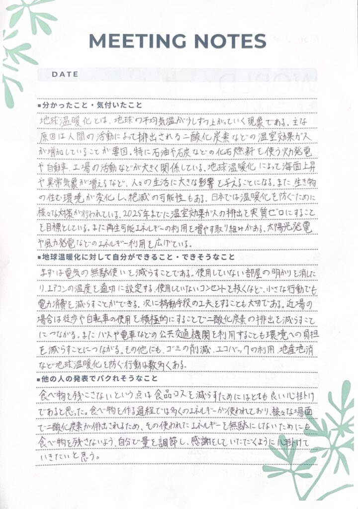 2100年8月の気温や、温暖化で食糧の生産が足りなくなった場合の話、お寿司が食べれなくなる未来!?など、衝撃的な話がありました。それを止める事ができるのも、改善し住みやすい環境を作っていくことも自分たち次第だという気づきのある時間となりました。一人一人が主体者意識を持ち、小さな積み重ねを続ければ大きな動きとなります。