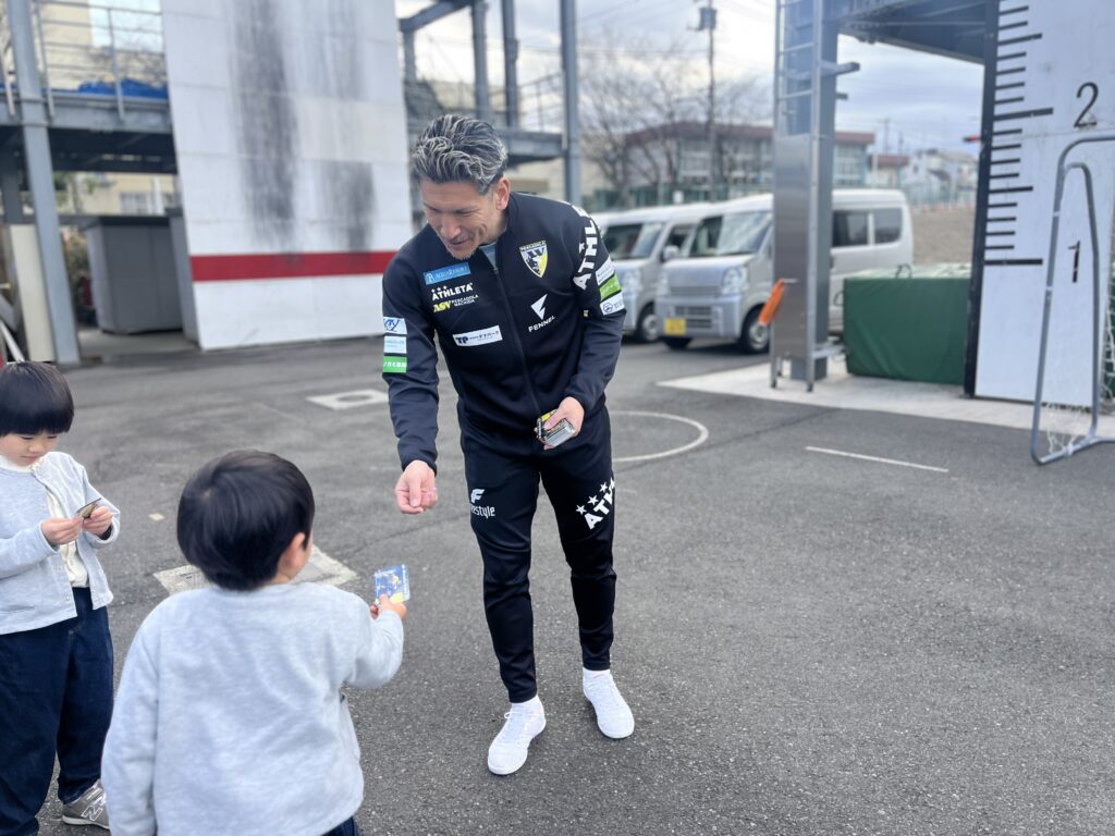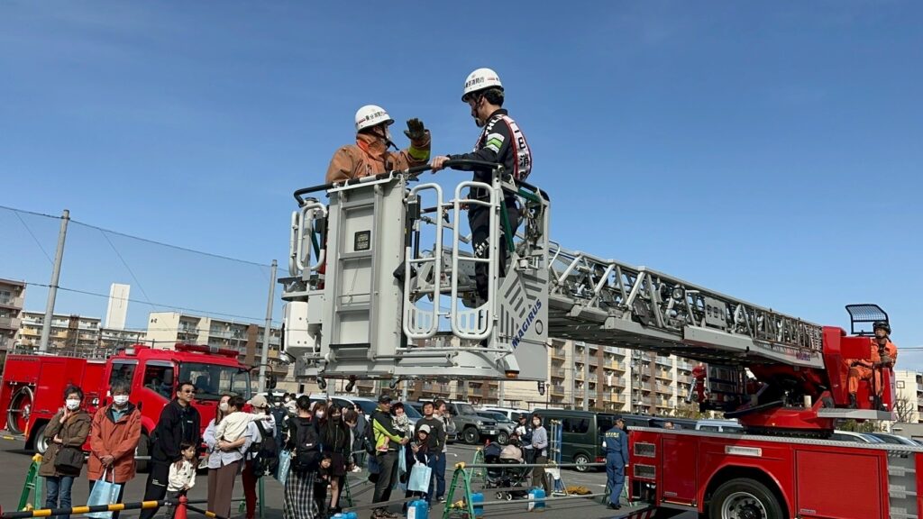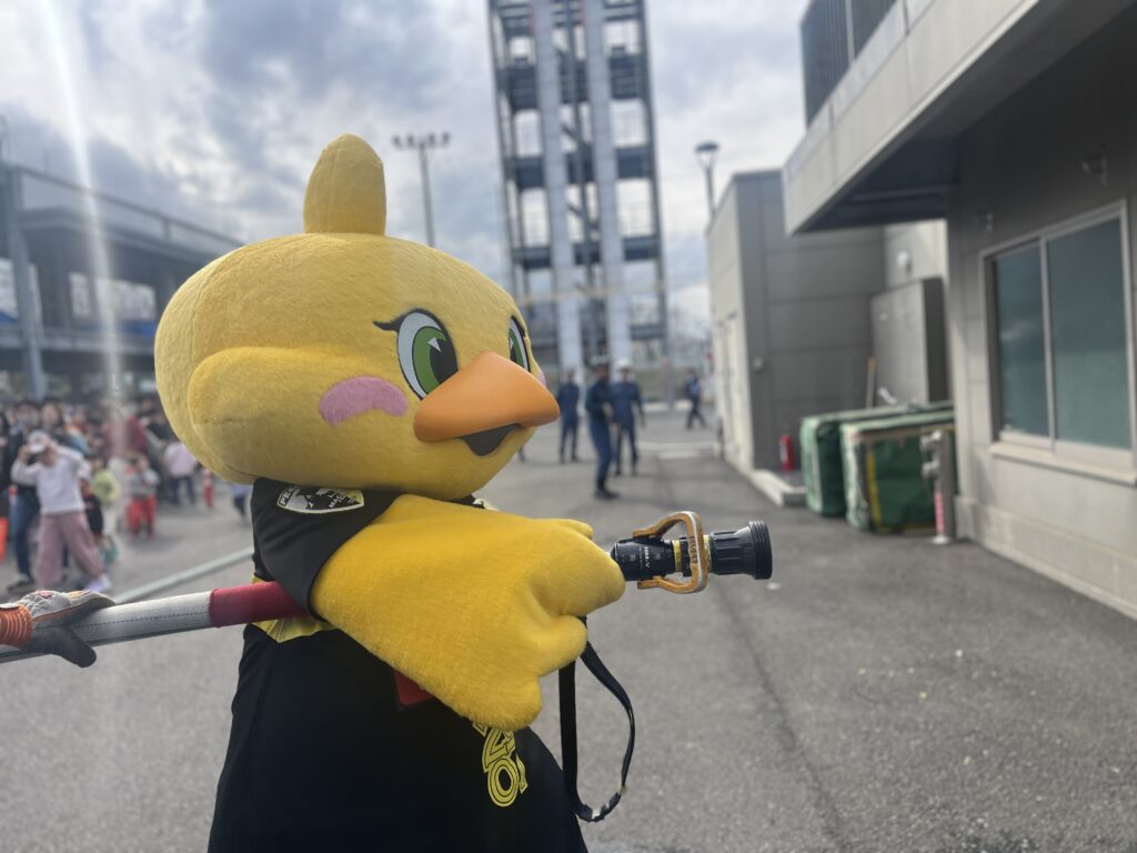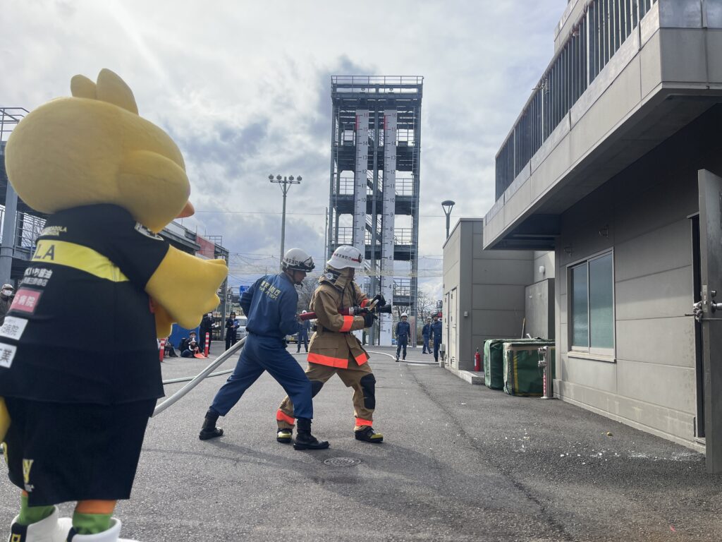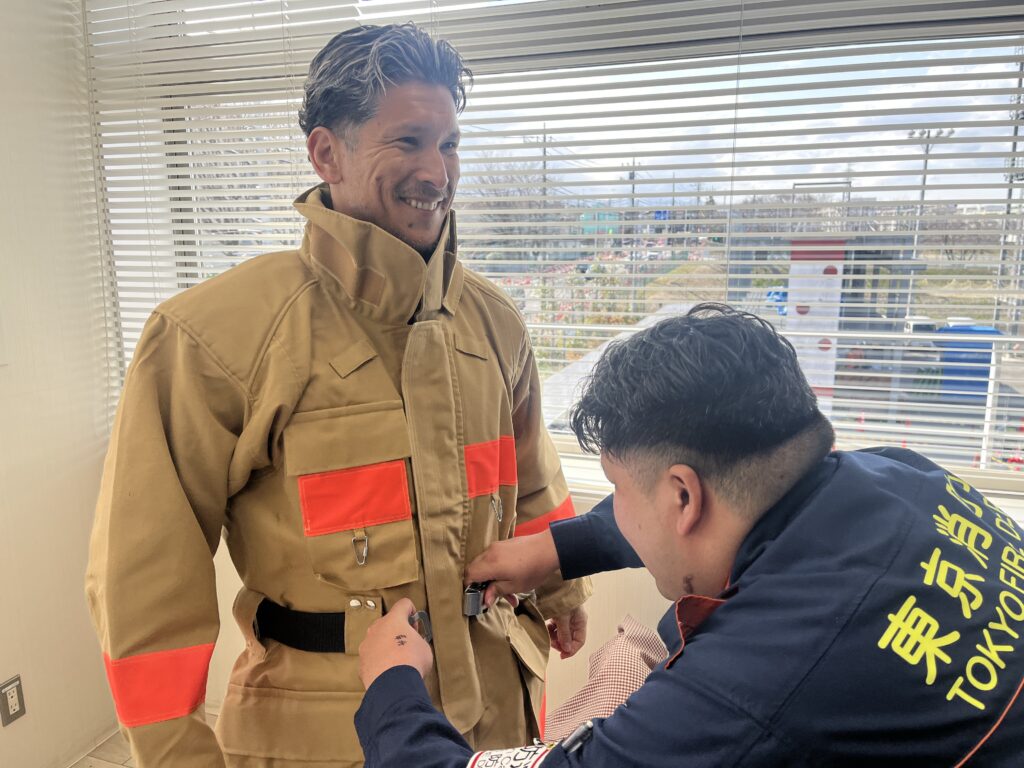 ポンプ車・救急車・はしご車の搭乗体験など子どもたちにとって夢のような時間が楽しめるイベントとなっています。森岡選手は消防士の防火服を身にまとい一日消防署長として貴重な体験をさせていただきました。