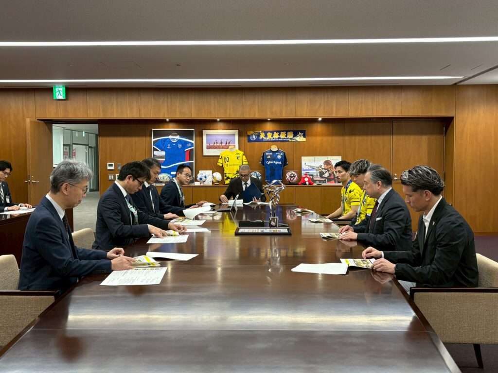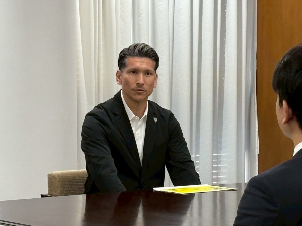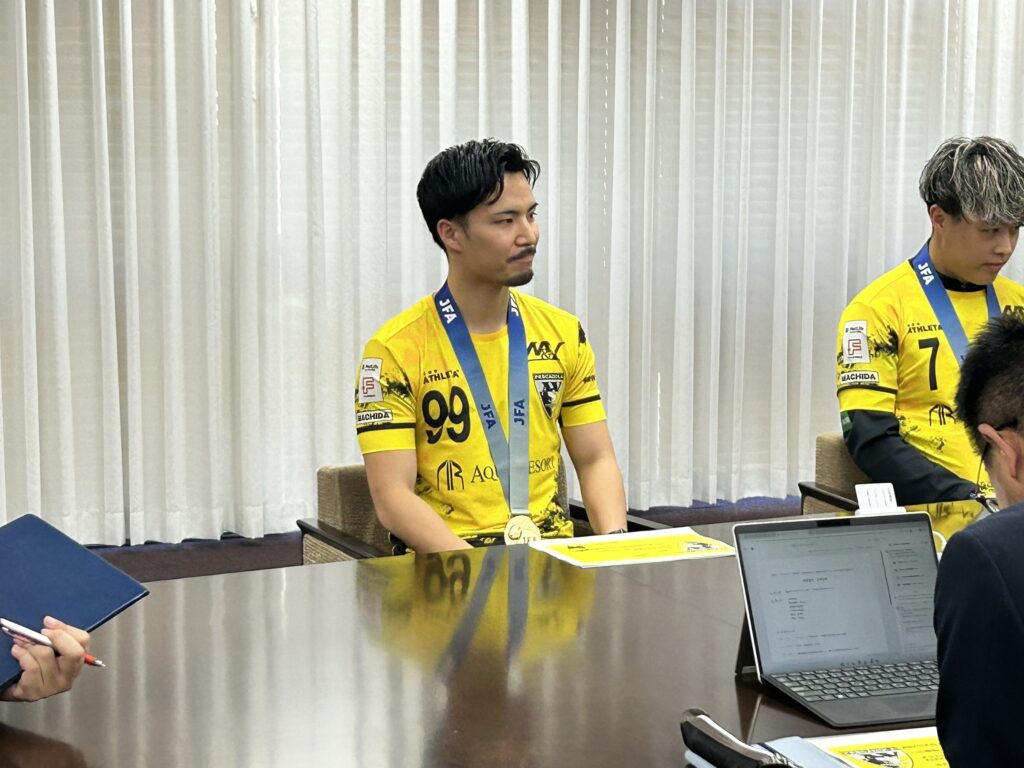 「本日は公務のお忙しい中、この様なお時間を頂き誠にありがとうございます。JFA 第31回全日本フットサル選手権大会優勝のご報告に、山中翔斗、甲斐稜人の2選手、そしてゼネラルマネージャーに就任した森岡薫と計4名で伺わせていただきました。