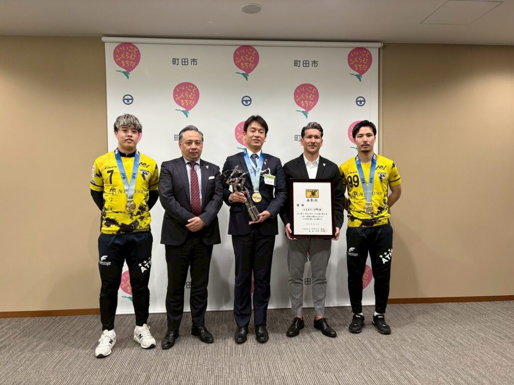 4月3日(金)に町田市役所に訪問させていただき、JFA 第31回全日本フットサル選手権大会優勝、並びにメットライフ生命Fリーグ2025-26シーズン終了のご報告をさせていただきました。稲垣康治市長との会談には、神蔵重徳副市長、堀哲副市長、老沼正彦文化スポーツ振興部長にも同席いただきました。
